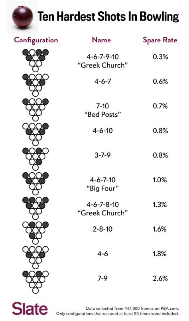 According to a fascinating statistical analysis of professional bowlers' scores since 2003, the hardest shot in bowling is actually the 4-6-7-9-10 split, also known in bowling lingo as a “Greek Church”.